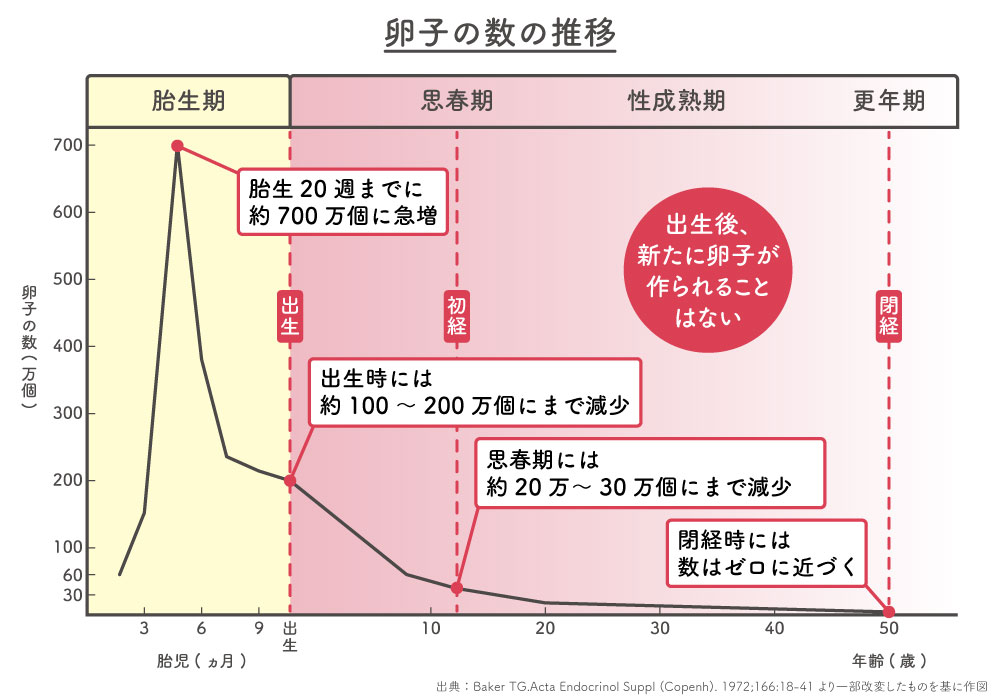 卵巣には、生まれたときに原始卵胞(卵子が入っている袋)が約100~200万個入っているとされており、その後、急速に減っていきます。思春期のころには約20~30万個となり年齢とともに減少し続けます。卵巣の中から卵胞がなくなって排卵が永久に停止すると、生理がなくなり、閉経となります。